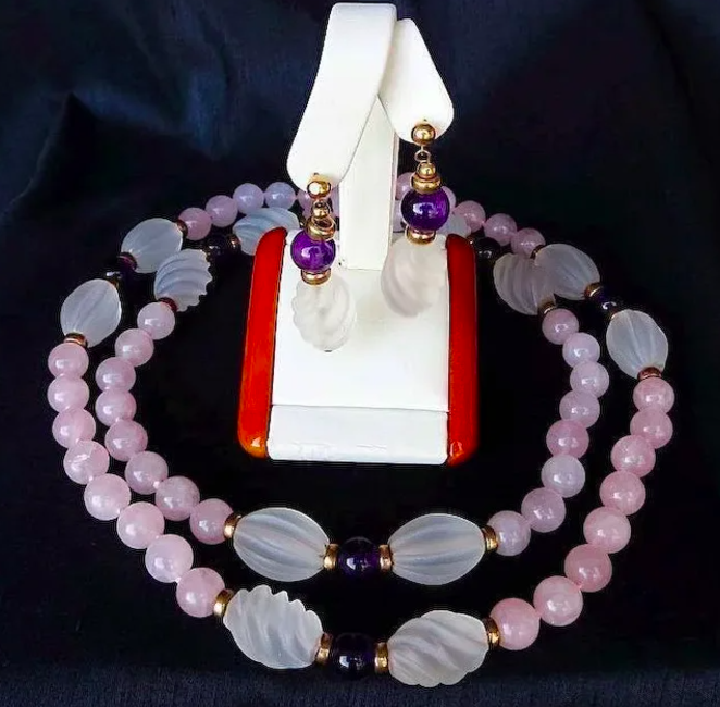 This is a very attractive vintage lady's necklace with matching earrings. The necklace consists of Rose Quartz beads , Amethyst beads, and spiral turned frosted Quartz beads while the earrings are 14K amethyst and frosted quartz. The combination of colors are subtle creating a beautiful effect. The necklace measures 16 3/4" long and is meant to be worn over the head without a clasp. Connecting the various sections of beads are acid tested 14K gold beads. The earrings measure 1 7/8ths" in length. This is a quality vintage necklace and earring set with a very elegant look.